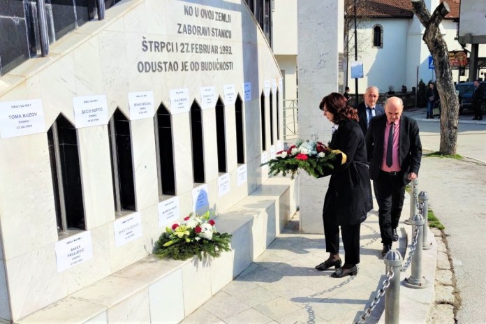 Curić je predvodila delegaciju BNV koja je položila cveće na spomen obeležje otetima u Štrpcima, a navela je da je danas veoma težak dan za Sandžak, Bošnjake i sve ljude čija su srca ispunjena ljubavlju.