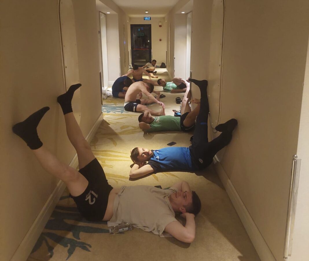 Na slikama su fudbaleri kluba koji treniraju u 22h po lokalnom vremenu i to u hodnicima hotela u kojem borave.