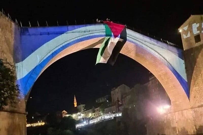 Na Starom mostu u Mostaru večeras je projektovana zastava Izraela povodom Dana sjećanja na pale žrtve, a nepoznate osobe su potom na most okačile i zastavu Palestine.