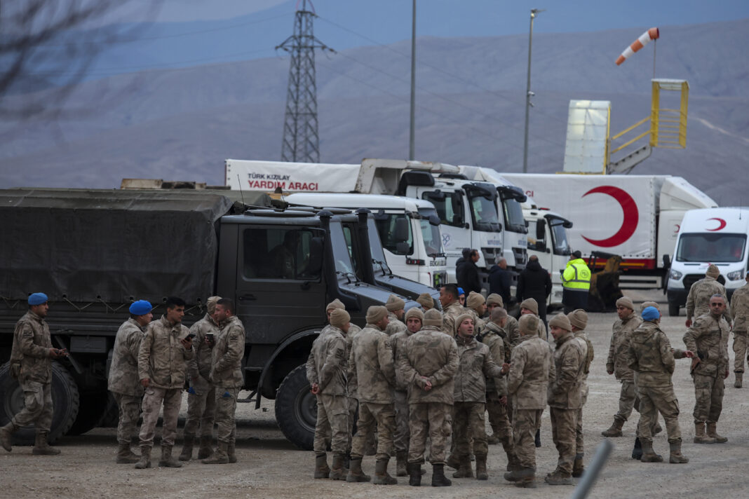 Military personnel stand at the entrance of the Copler gold mine near Ilic village, eastern Turkey, Wednesday, Feb. 14, 2024. Hundreds of rescuers on Wednesday pressed ahead with efforts to search for several workers trapped at a gold mine in eastern Turkey that was engulfed by a massive landslide. (Ugur Yildirim/Dia images via AP) ISTANBUL- Stotine spasilaca u Turskoj nastavljaju danas potragu za najmanje devet radnika, zarobljenih u rudniku zlata na istoku zemlje koji je pogođen ogromnim klizištem.