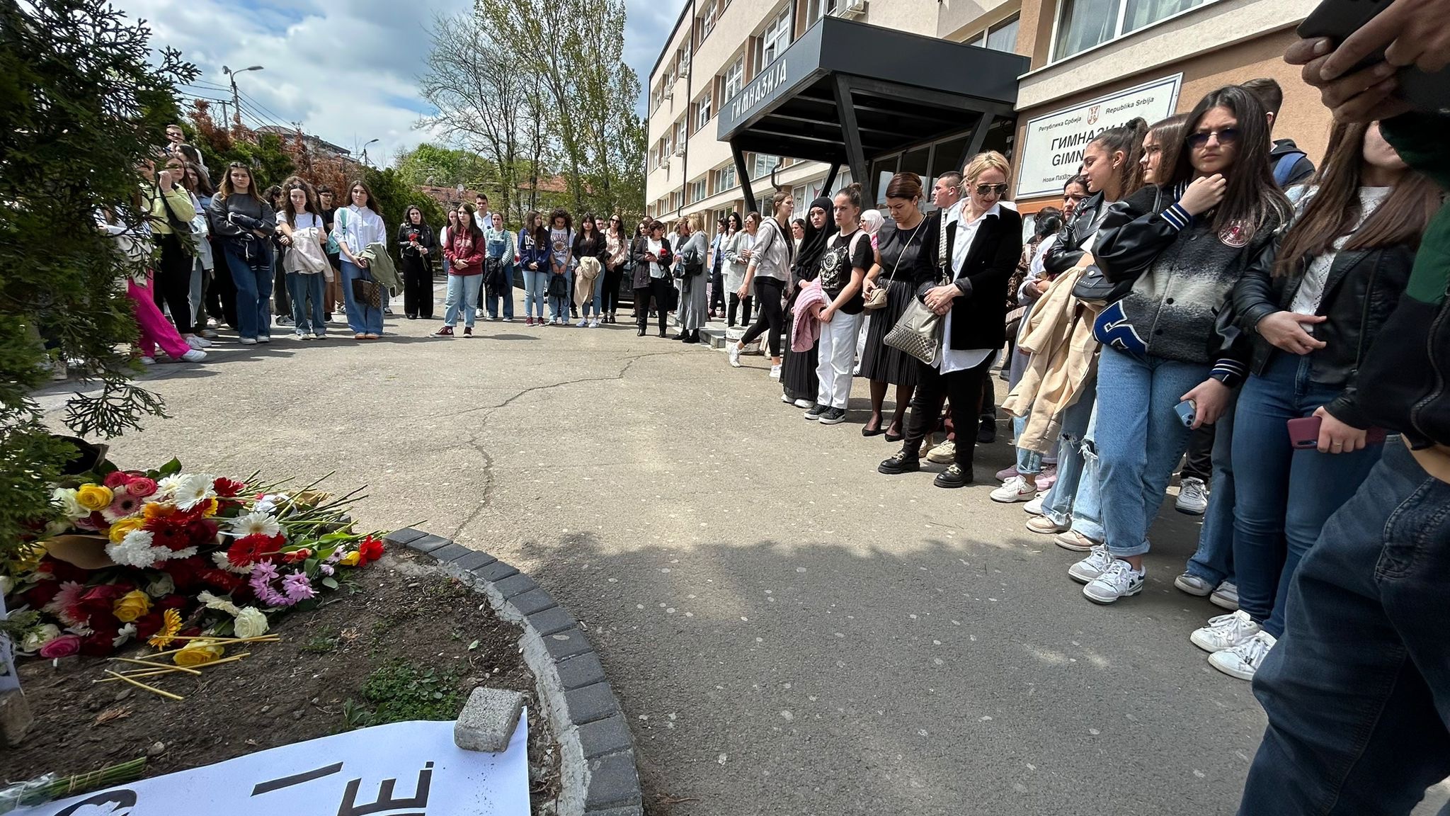 Novopazarski gimnazijalci su položili cveće uz plakate sa natpisima “S neizmernom tugom, Gimnazija Novi Pazar” i “Ne ponovilo se. Nigde i nikome. 3. maj 2023.”.