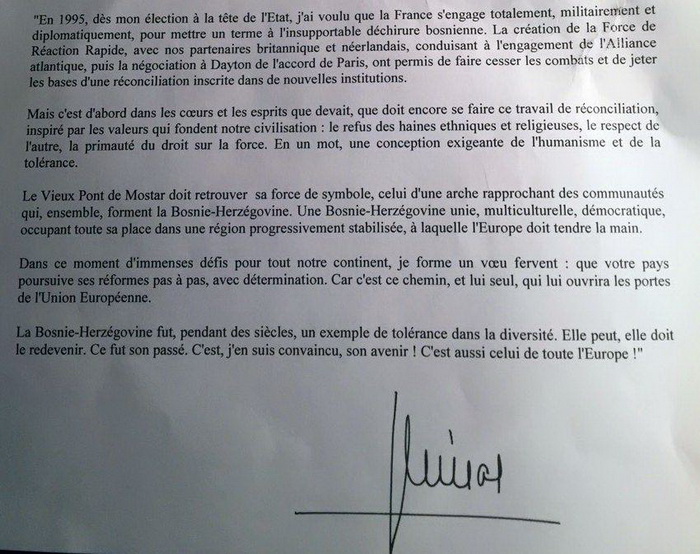 Bosna i Hercegovina je stoljećima bila primjer tolerancije u raznolikosti. Ona može i treba to ponovo postati! To je bila njena prošlost. To je, ubjeđen sam, i njena budućnost. To je budućnost i cijele Evrope“, naveo je Chirac u pismu.