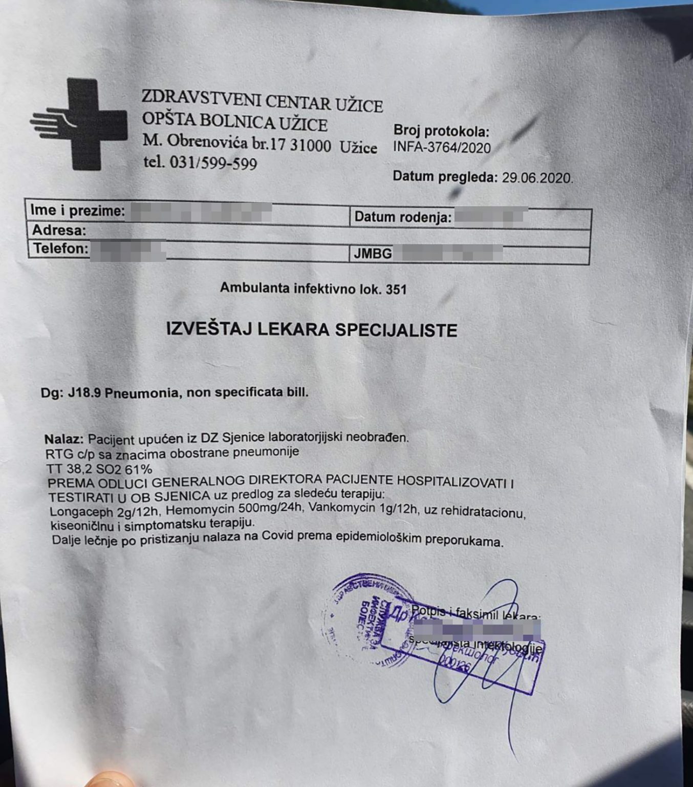 To su, kako saznaje naš portal, učinili i 29. juna, kada su dva sugrađanina sanitetom poslali za Užice. Po dolasku tamo, međutim, ljude nisu ni primili u bolnicu, već su ih užički lekari pregledali u istim ambulantnim kolima. Prema dokumentaciji koju posedujemo, njima je dijagnostifikovana dvostruka pneumonija i već su se borili za dah. Iako nisu bili testirani, kažu naši sagovornici, bilo je više nego očigledno da obojica boluju od COVID 19.