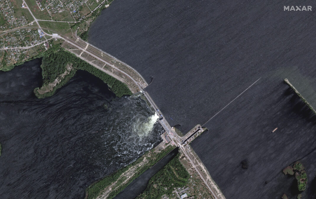 (Maxar Technologies via AP) KIJEV – Ukrajinski predsednik Volodimir Zelenski optužio je danas Rusiju da su njene snage iznutra digle u vazduh branu hidroelektrane Kahovka na jugu Ukrajine.